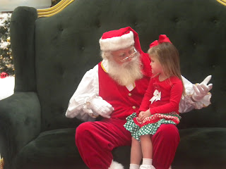 We always go shopping the day after Thanksgiving, and we usually go EARLY! Well, my mom had to work through the night this year, so we got ready and headed out by 10. We picked up grandma, and Lil, Mimi, Grandma, Linds, and I went to Aventura. The Christmas setup they have there is so great, and Lily just loves it. She rode the train with Auntie Linds, and then she got to go see Santa! She LOVED him, and told him everything that she wanted! :) We ate lunch and shopped around a little, and then Papa and Daddy came to pick Lil up to go see Happy Feet 2...she fell asleep in the beginning and missed the whole thing! She was a tired pup!!! We had a great day!